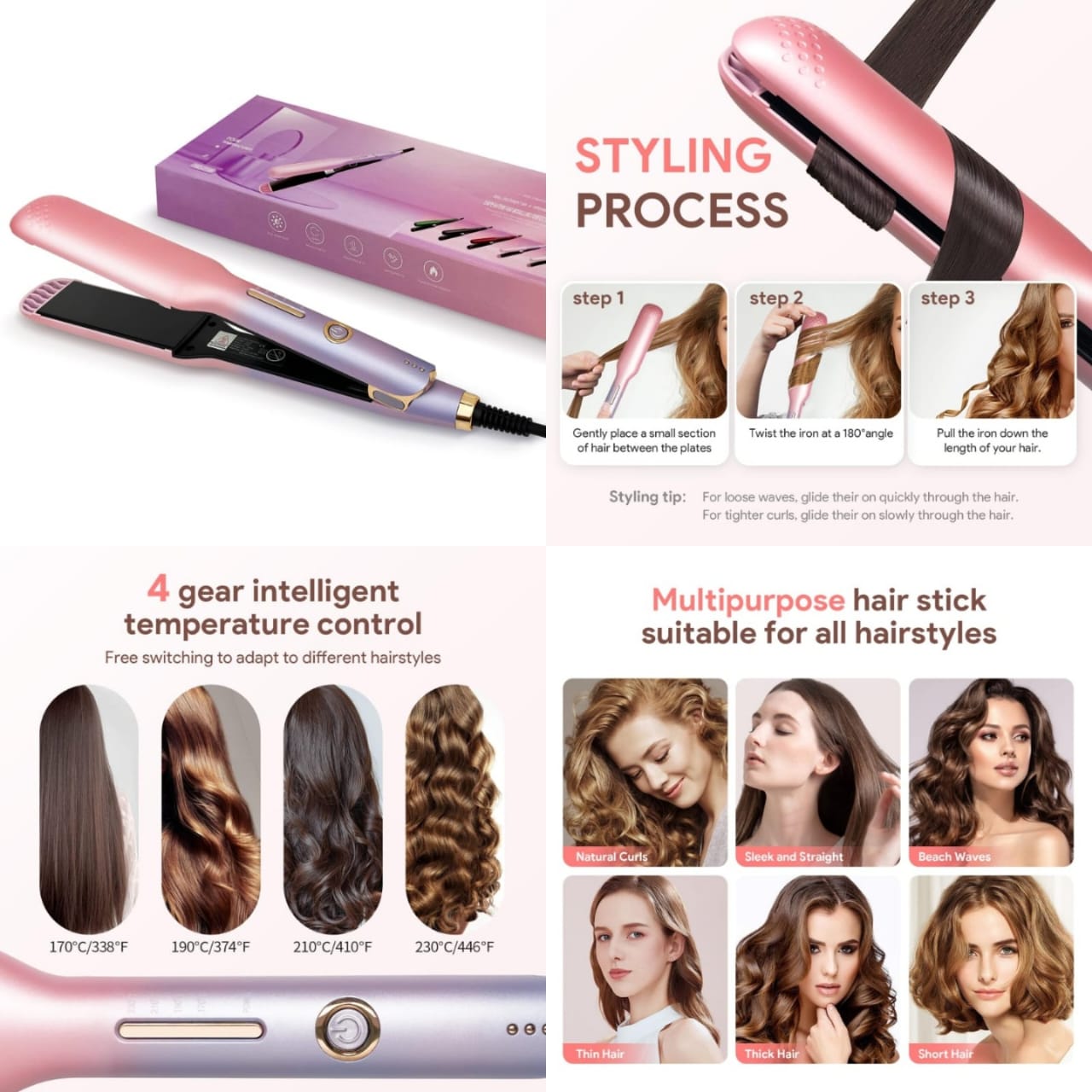 Suitable for all hair types. This versatile hair types. This versatile hair tool offers four heating levels ranging from 338 to 450˚ F, ensuring optimal performance for various hair textures. Boasting speedy 12-second heating, it quickly reaches the desired temperature without snagging, allowing you to achieve professional results in a single pass. Random colour will be sent.