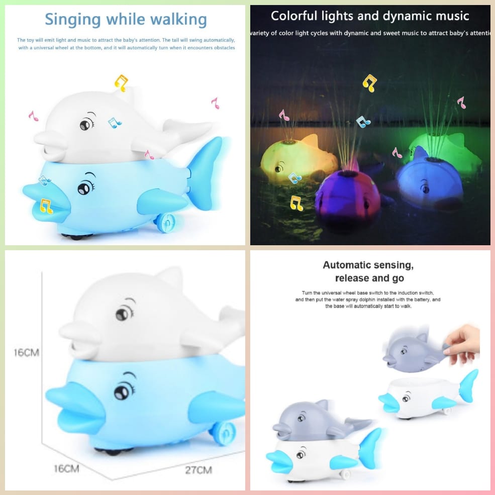 This musical bath toys in 2in1 set, induction water spray toy & UFO space car toy, which brings double fun. As bath toy, it can automatically squirt water with colourful lights and make bubble sounds. As a moving car toy, it can drive freely on the land with music and lights, wag its tail, automatically avoid obstacles. Requires 3 x AAA batteries in the grey water spray dolphin and 3 x AAA batteries in the base. (not included).