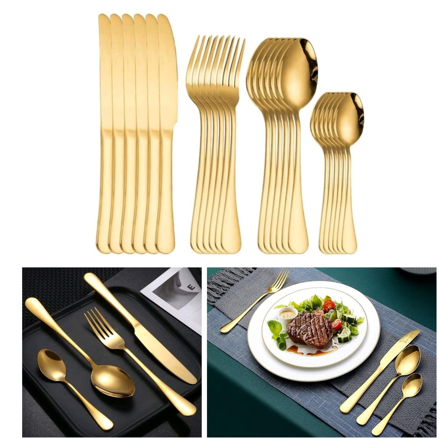 Elegant Gold Finish. Adds a luxurious touch to dining tables. Set incudes 6 Dinner Forks, 6 Dinner Knives, 6 Dinner Spoons and 6 Tea Spoons. In packets. Does not come with gift box.
