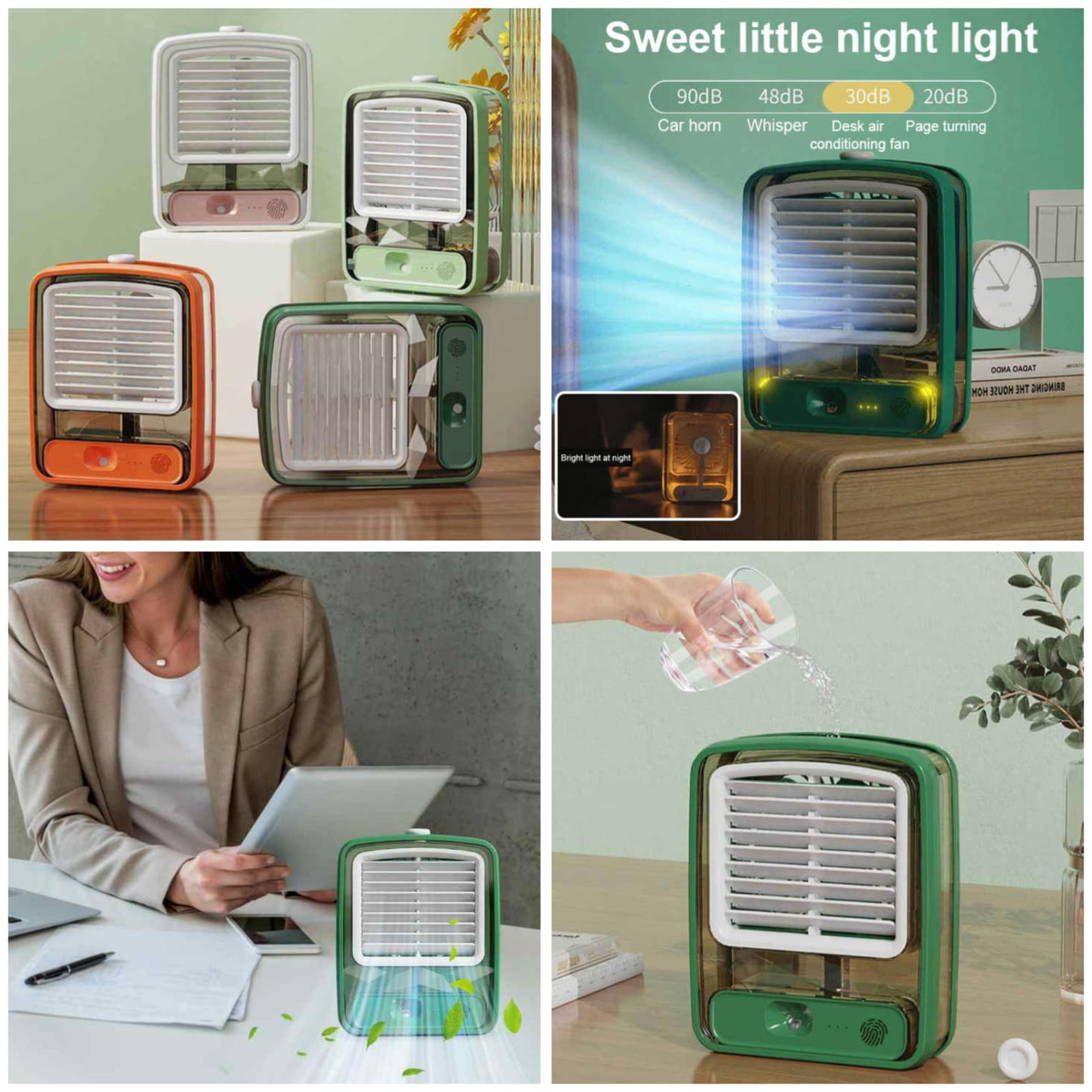 Beat the heat this summer with this desktop spray fan. Multifunctional three-in-one, can be a humidifier, can be an LED night light & fan. Rechargeable. 13.8×17.8cm. Random colour