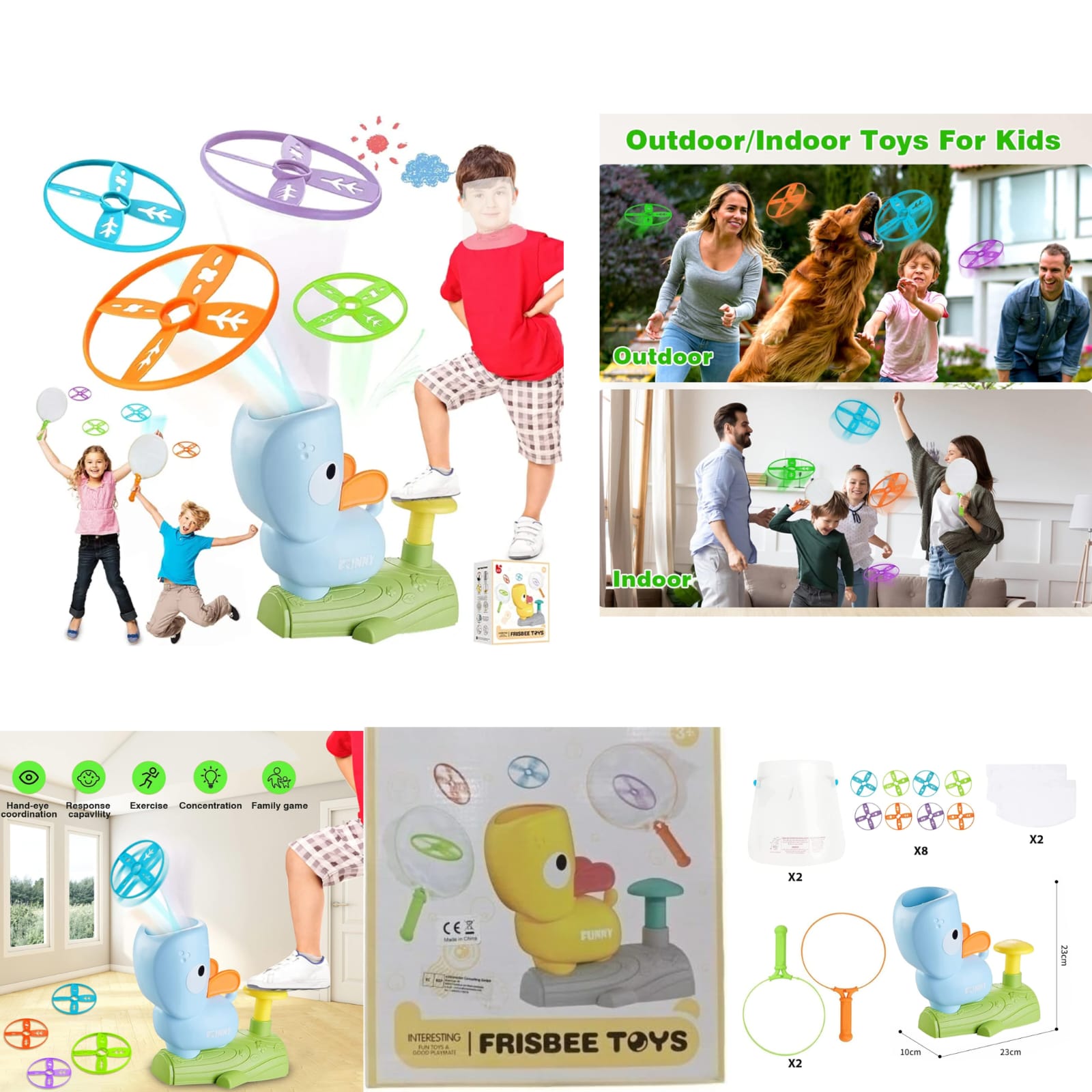 Simply place the flying discs in the launcher, step on the button, and the discs fly out. The child can then use the net to catch the discs. 23x23x10cm. Random colors.